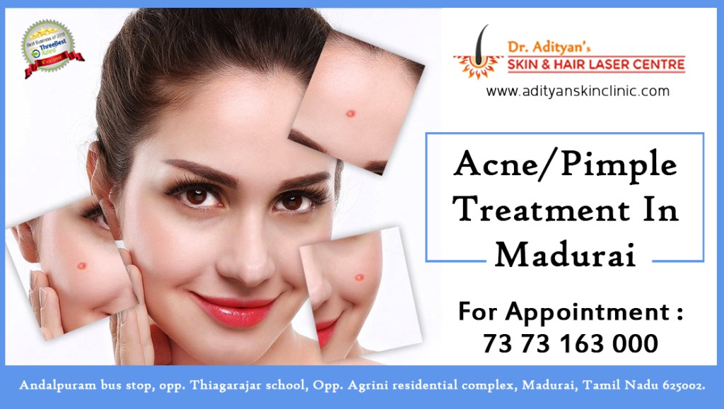 Whiteheads, blackheads, pimples, cysts are all types of acne. For male, excess of androgens causes acne and for female, oestrogen and androgens cause acne. Acne commonly starts during puberty time. Normally, acne going away at the age of 20 but for some people, it refused to go away maybe they like their skin. I am kidding guys. Just search your internet as Acne/Pimple Treatment In Madurai to book your appointment or call us at 7373163 000 to know about the hospital timings. For more information or know about our other treatments, you can surf our website at www.adityanskinclinic.com. For more updates surf at www.acnepimplecureinmadurai.blogspot.com